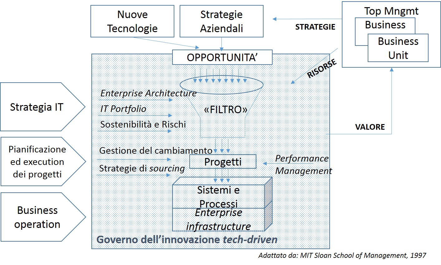 Il modello che vedete qui è un mio adattamento di quello utilizzato alla fine degli anni ’90 dalla Sloan School of Management dell’MIT di Boston nei corsi di IT essential per non-IT executives, ed ha il pregio di essere molto semplice e tuttavia esaustivo.