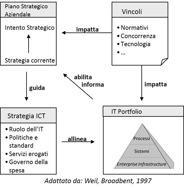 Lo schema seguente (mutuato da Weill & Broadbent) presenta i 4 ingredienti di un approccio tradizionale all’allineamento fra il portfolio IT e la strategia di business: i vincoli di natura ambientale, il contesto strategico aziendale (o di una business unit), la strategia dell’Information & Communication Technology, il portfolio IT.