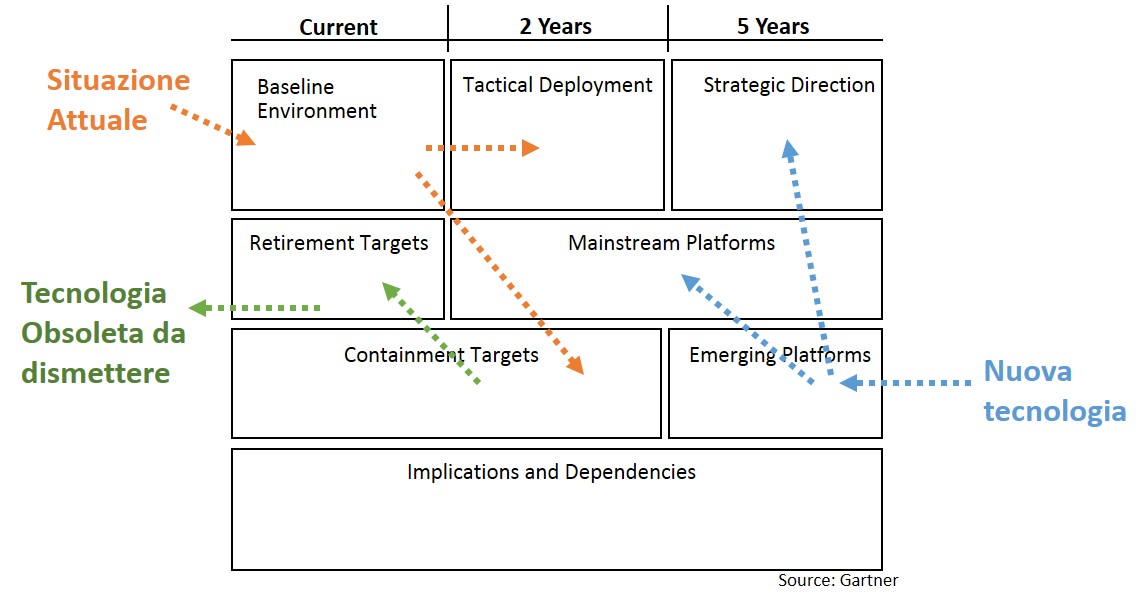 - Retirement: Le tecnologie e gli standards che l’azienda già utilizza e si aspetta di abbandonare nell’orizzonte temporale della valutazone strategica.