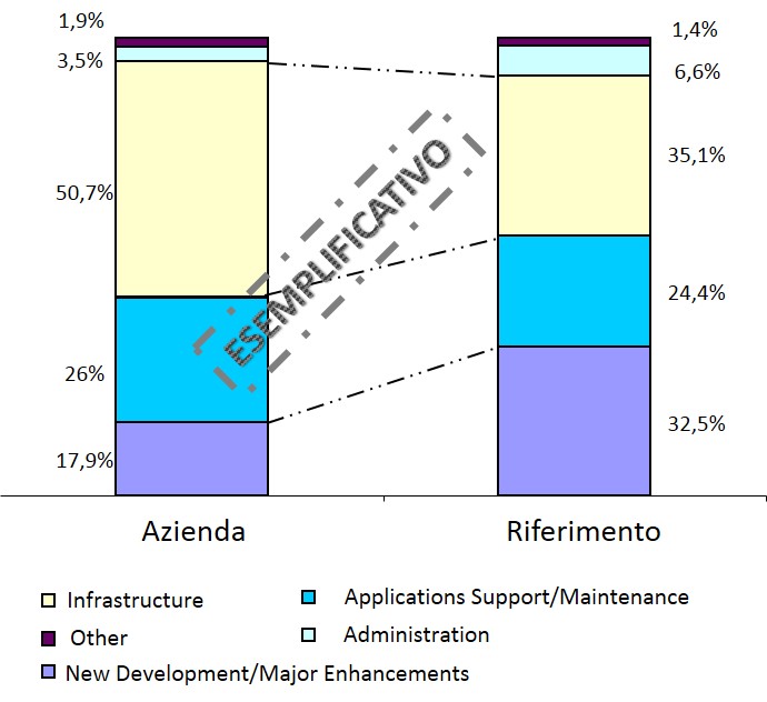 Nell’esempio che vedete si evidenzia un maggior assorbimento rispetto al benchmark di risorse da parte delle attività di tipo non discrezionale (infrastruttura e manutenzione/supporto applicativo), rispetto allo sviluppo di nuovi sistemi o funzioni. Questo può essere dovuto, ad esempio, dalla maggior incidenza dei costi di gestione delle infrastrutture tecnologiche dovuto a potenziali economie di scala non conseguite e/o a meccanismi organizzativi che non sono in grado di indirizzare correttamente la spesa.