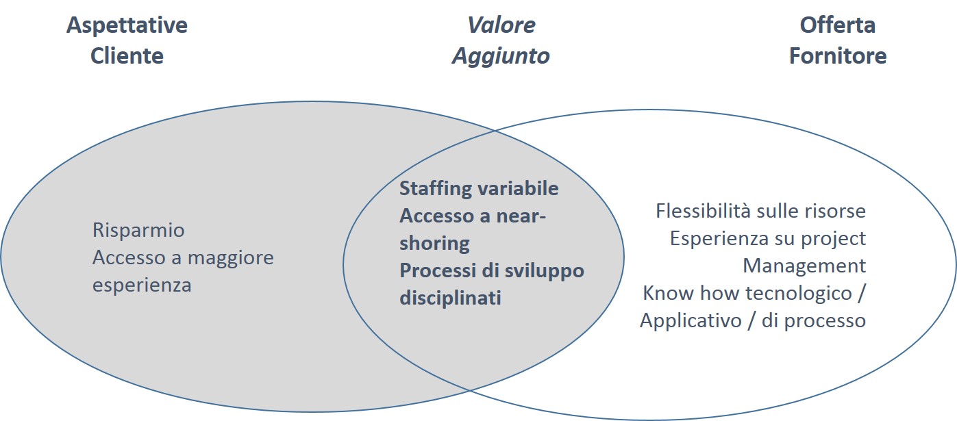 Il punto di forza del fornitore sul mercato dovrebbero essere flessibilità sulla disponibilità di risorse e competenze (rese disponibili solo quando e nella misura necessaria), esperienza su project management nel dominio specifico dell’innovazione oggetto del progetto di cambiamento, know how tecnologico / applicativo / di processo sullo stesso ambito. Qui stiamo parlando di economie di scopo, più che di economie di scala.