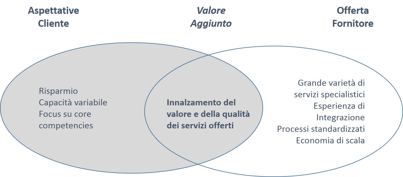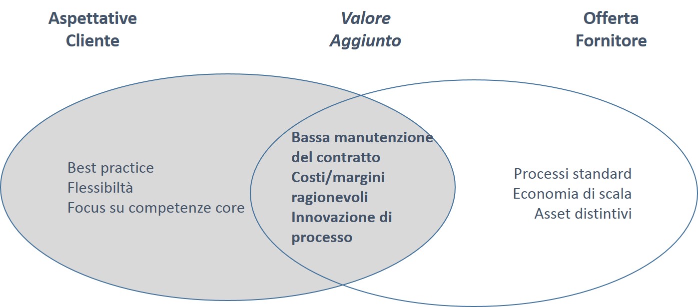 Le aspettative del fornitore sono di poter applicare processi standard e quindi poter usufruire di economie di scala dovute alla replicabilità del servizio. Il suo punto di forza sul mercato dovrebbero essere asset distintivi (in termini di competenze tecnologiche o veri asset fisici quali ad esempio centri elaborazione dati o reti di telecomunicazione, centri di servizio).