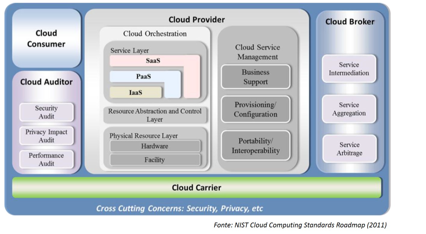 Insieme alla definizione di Cloud Compunting, il National Institute of Standards and Technology fornisce una serie di schemi di alto livello che consentono di comprendere i meccanismi di funzionamento di un ambiente cloud, a partire dai 5 attori principali – persone oppure organizzazioni – che contribuiscono al funzionamento, dai modelli di servizio e dalle interrelazioni fra questi. Vediamone alcuni:
