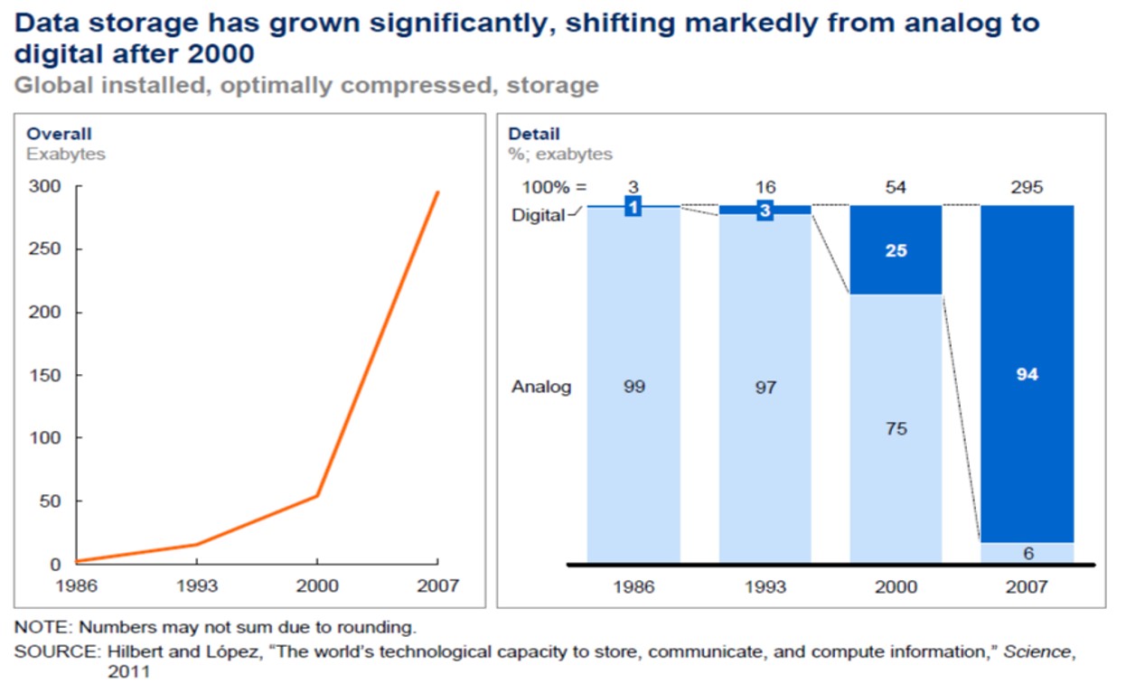 Da una ricerca di Martin Hilbert e Priscilla Lopez, pubblicata nello stesso periodo sulla rivista Science, possiamo vedere che il tasso di crescita delle informazioni è stato esponenziale a partire dal 2000 e, nel giro di venti anni, abbiamo assistito al completo capovolgimento del mix fra informazioni di tipo analogico (che ormai sono solo intorno al 6%) e informazioni digitali.