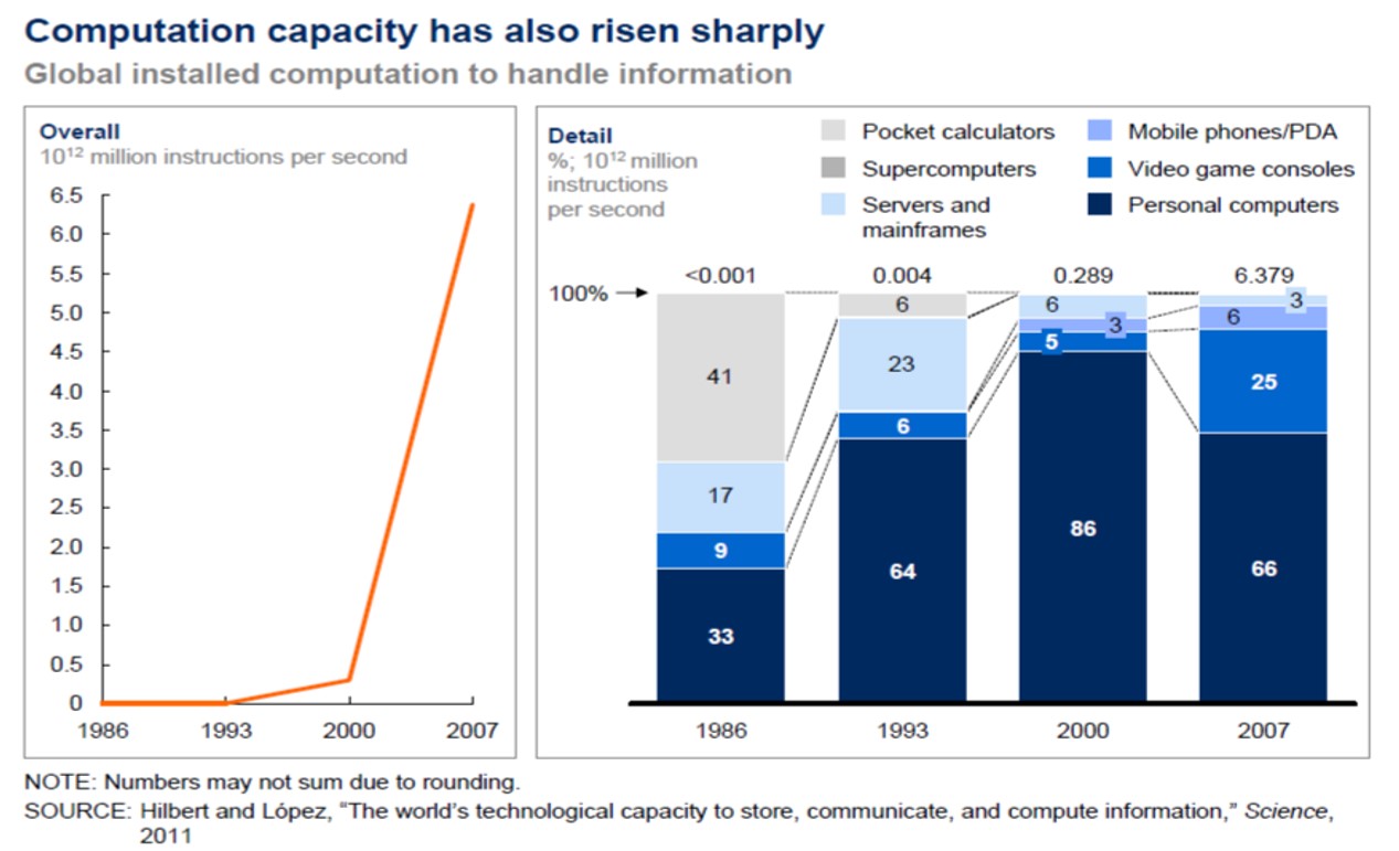 La capacità elaborativa mostra tassi di crescita analoghi, a partire dal 2000, ma quello che è più impressionante è la composizione, fortemente sbilanciata a favore di dispositivi di produttività personale, a partire dai PC, usati anche in ambito aziendale, che coprono i 2 terzi, mentre un altro 30% è rappresentato da console digitali e dispositivi mobili.