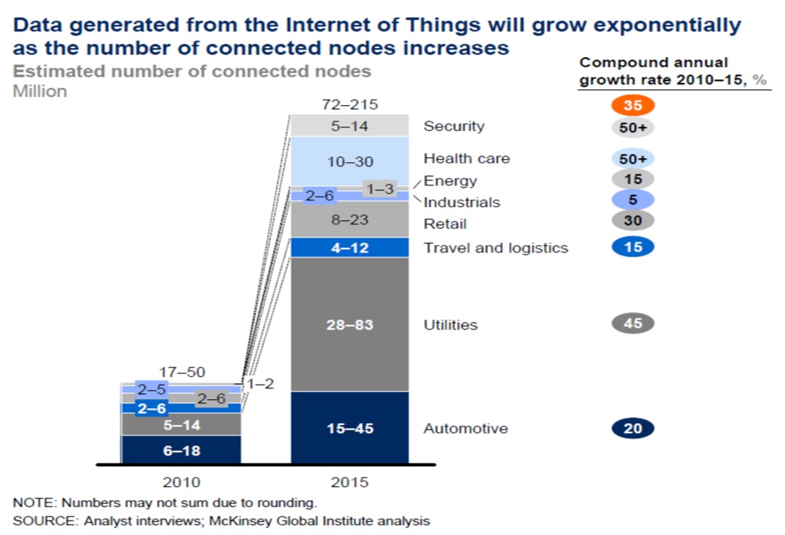 Un altro fenomeno interessante, in termini di volumi di dati generati, è la cosiddetta «Internet delle cose», cioè i dati generati dai sensori inglobati in molti dispositivi elettromeccanici di uso quotidiano, che nell’arco di 5 anni potrebbe quintuplicare il numero di nodi. I dati che vedete sono espressi in milioni e ci sono aspetti molto rilevanti anche per la nostra salute ed il nostro benessere.