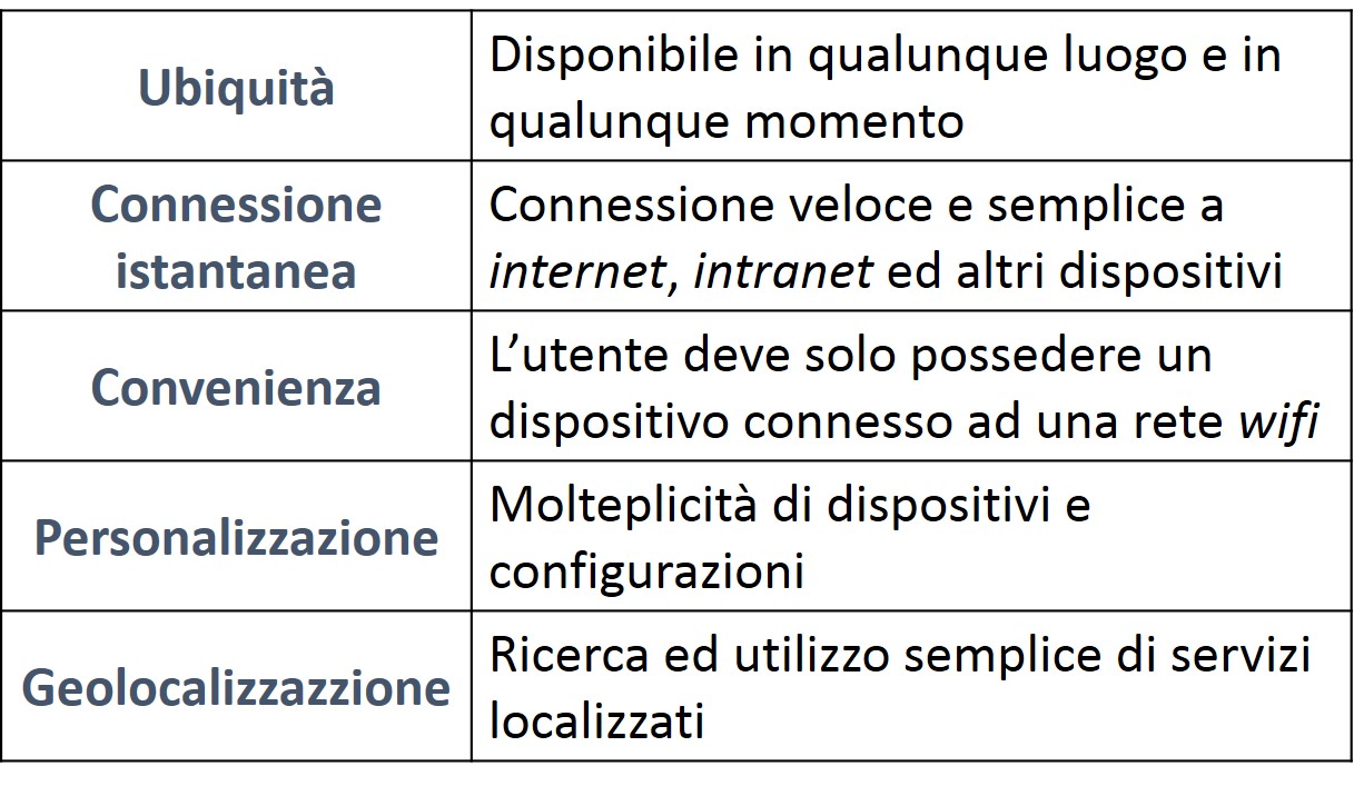 La proposizione di valore della connettività mobile si può esprimere in maniera abbastanza intuitiva con 5 caratteristiche principali di questo modello di computing: