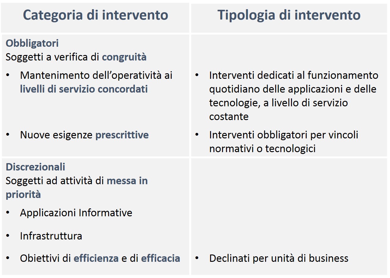Fra gli interventi discrezionali, potrebbe essere utile, per diminuire la complessità di gestione del portafoglio progetti, segmentandolo opportunamente, separare gli interventi dedicati all’evoluzione dell’infrastruttura da quelli applicativi.