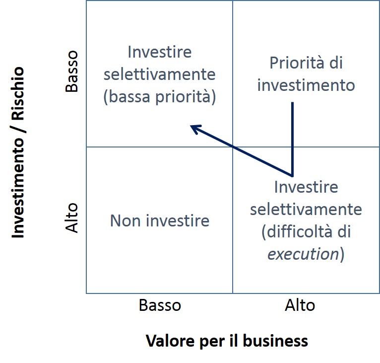 Ogni progetto va collocato in uno dei quadranti, e la scala di priorità che assumeranno gli interventi nel nostro piano di innovazione segue la freccia.