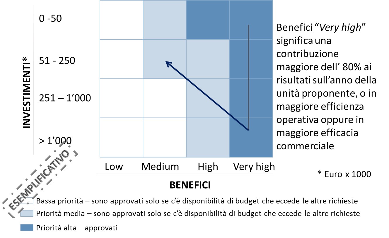 Ad esempio, si può stabilire che benefici “Very high” significa una contribuzione maggiore dell’ 80% ai risultati sull’anno della unità proponente, o in maggiore efficienza operativa oppure in maggiore efficacia commerciale.