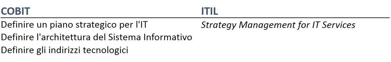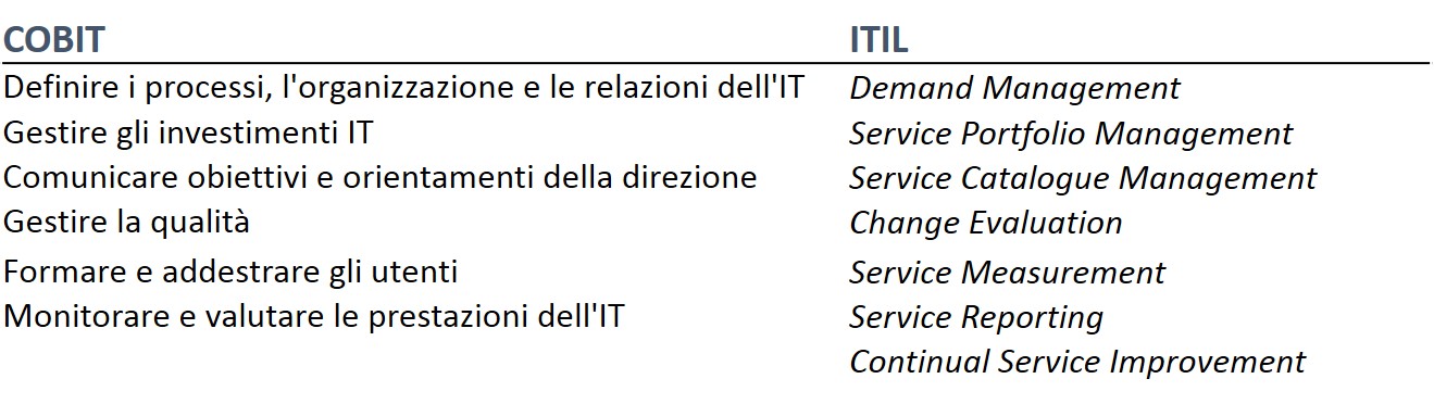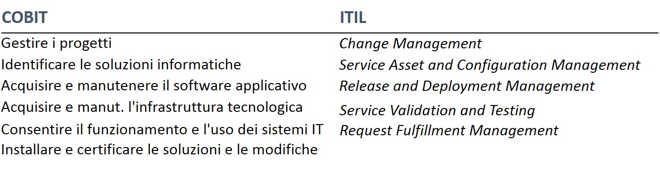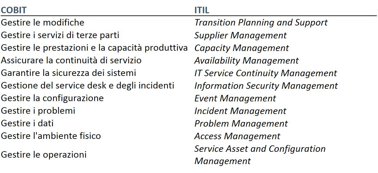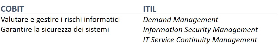Nelle tabelle vedete i puntatori ai relativi processi CoBIT e ITIL per approfondimenti.