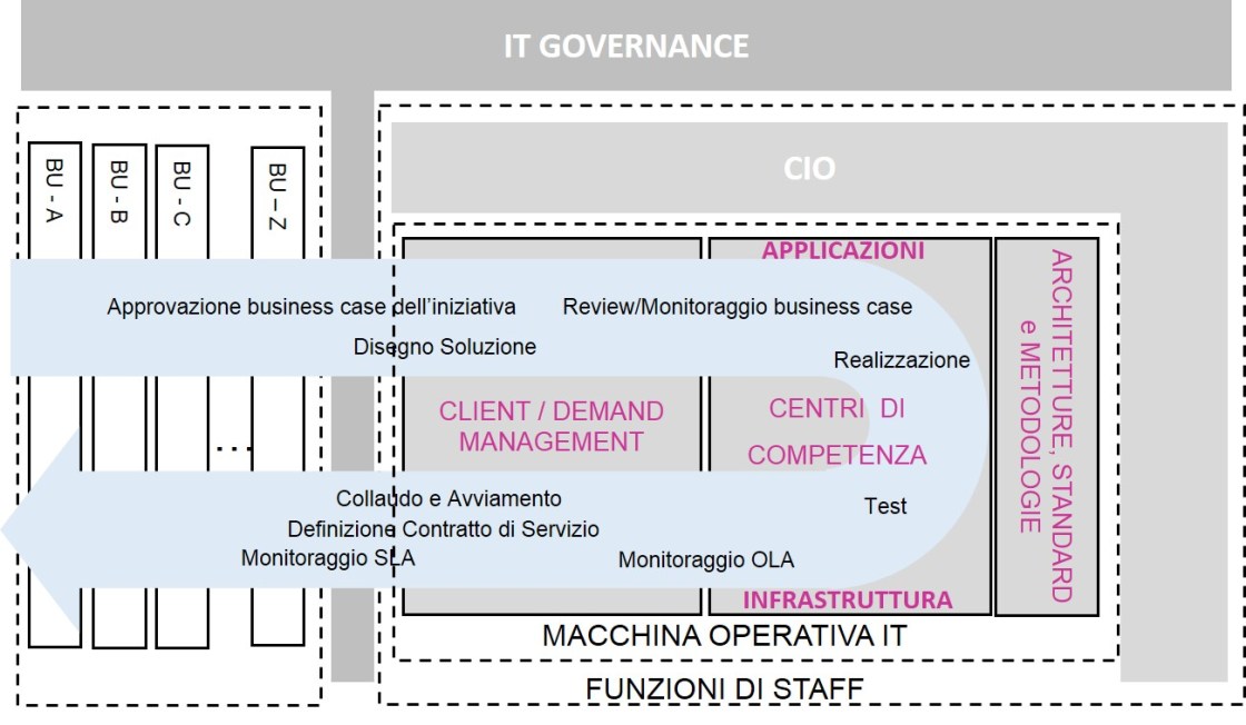 - Gestione della domanda e Relazione con gli utenti: comprende la raccolta delle esigenze di automazione e formazione del portafoglio iniziative che verranno messe in priorità e finanziate attraverso il processo di stesura del piano progetti ed una comunicazione continua e bidirezionale con gli utenti dell’IT, con riferimento, fra l’altro, al livello di qualità percepito nell’andamento delle iniziative progettuali e nell’erogazione dei servizi.