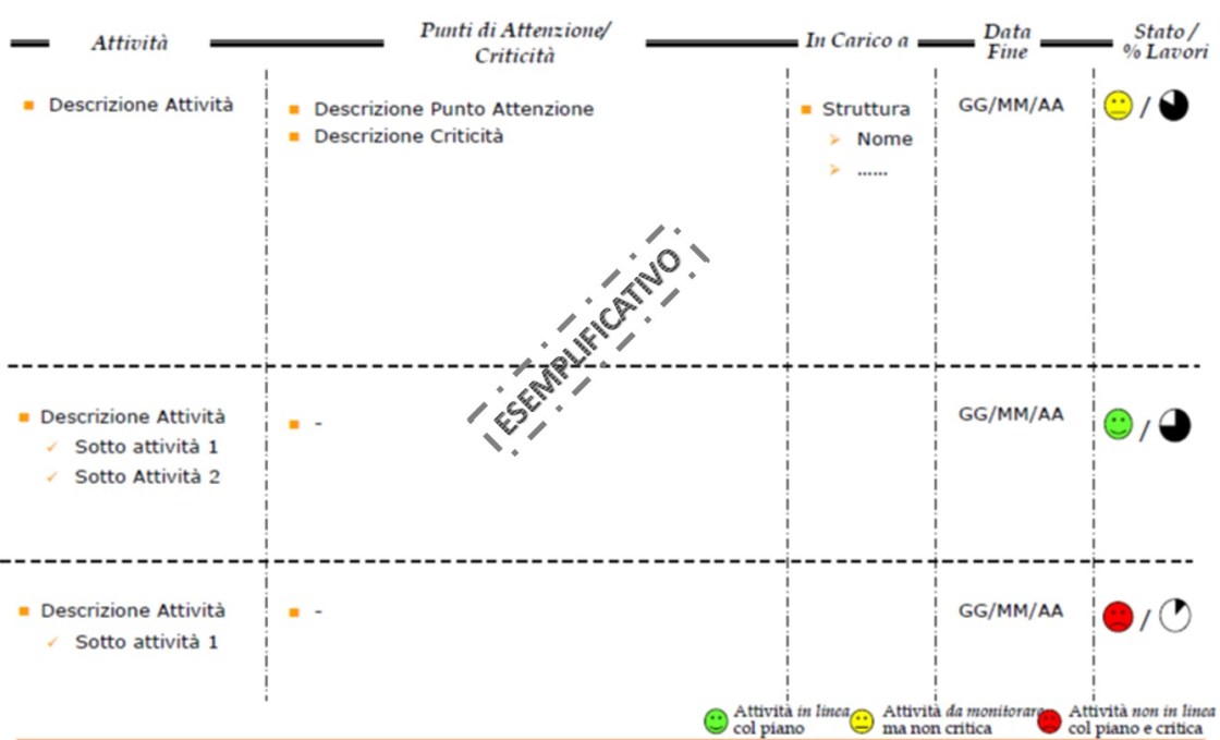 Periodicamente viene prodotta una scheda di monitoraggio (o stato avanzamento lavori – SAL) che sintetizza:
