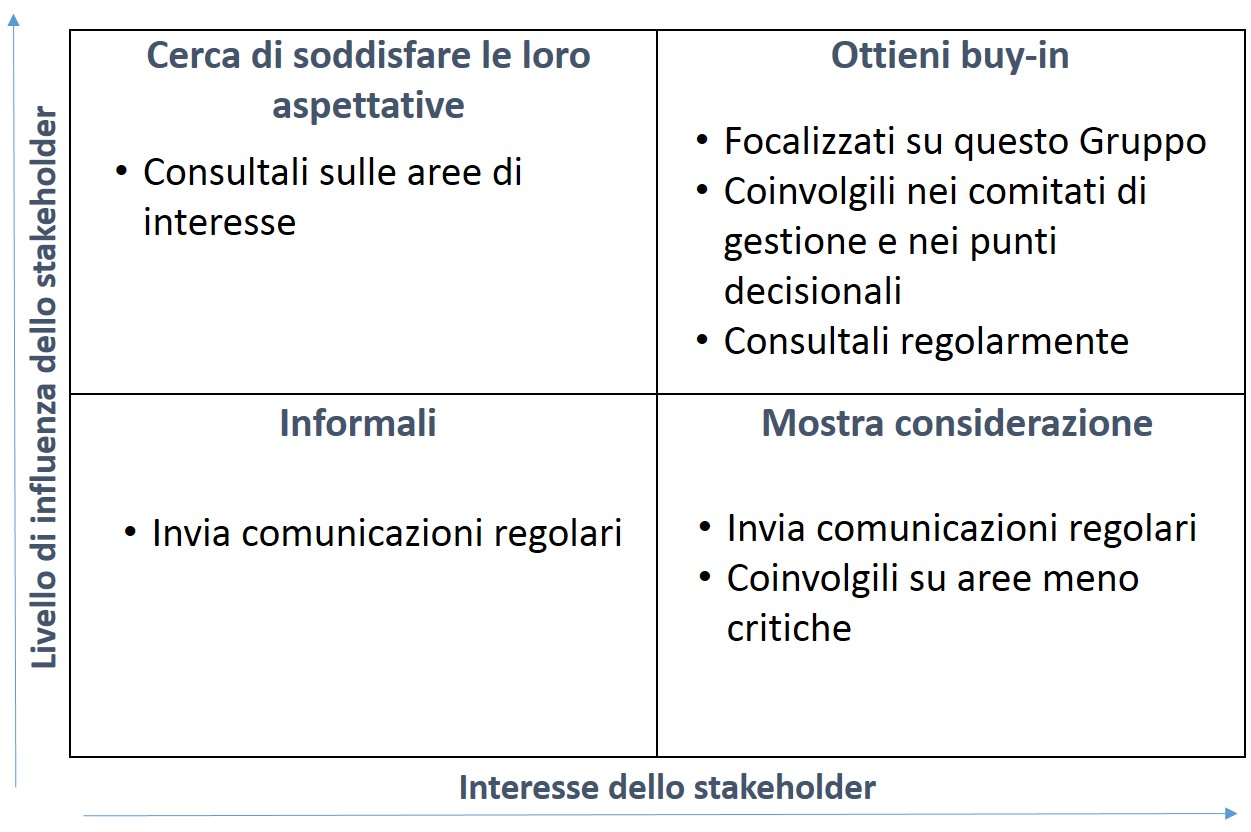 Nella fase di definizione dell’idea, in cui si produce una bozza del Piano d’Azione, che stabilisce gli obiettivi, l’approccio e il perimetro dell’intervento, cruciale è l’identificazione degli stakeholders: uno stakeholder è chiunque abbia un interesse legittimo nell’attività di cambiamento, e quindi ci saranno individui con diversi ruoli, responsabilità a grado di influenza. È importante capire quali stakeholder sono particolarmente influenti, come facilitatori o come detrattori, e stabilire in questa fase come coinvolgerli. Uno schema abbastanza semplice ti farà identificare dove focalizzarti.