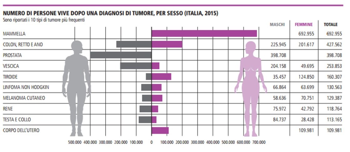 Numero di pazienti viventi e % di sopravvivenza in Italia. Fonte: Airtum (Associazione Italiana Registri Tumore), 2015