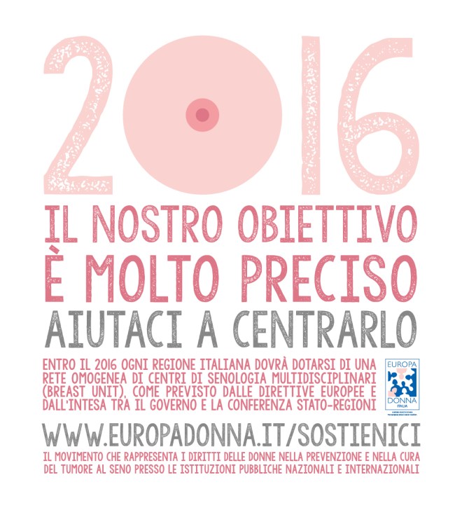 La buona notizia è che, grazie anche al lavoro attivo di movimenti ed associazioni di pazienti, fra cui Europa Donna Italia, il 5 aprile 2011 il Senato ha approvato all’unanimità la Mozione n. 399 sul tumore al seno, che impegnava il Governo a vigilare sull’attuazione delle direttive europee in materia da parte delle regioni. E il 18 dicembre 2014 la Conferenza Permanente per i Rapporti tra lo Stato, le Regioni e le Provincie Autonome di Trento e Bolzano ha sancito l’intesa tra Governo, Regioni e Province Autonome sul documento recante le “Linee di indirizzo sulle modalità organizzative ed assistenziali della rete dei centri di senologia”, da rendere attuativo entro il 31/12/2016.